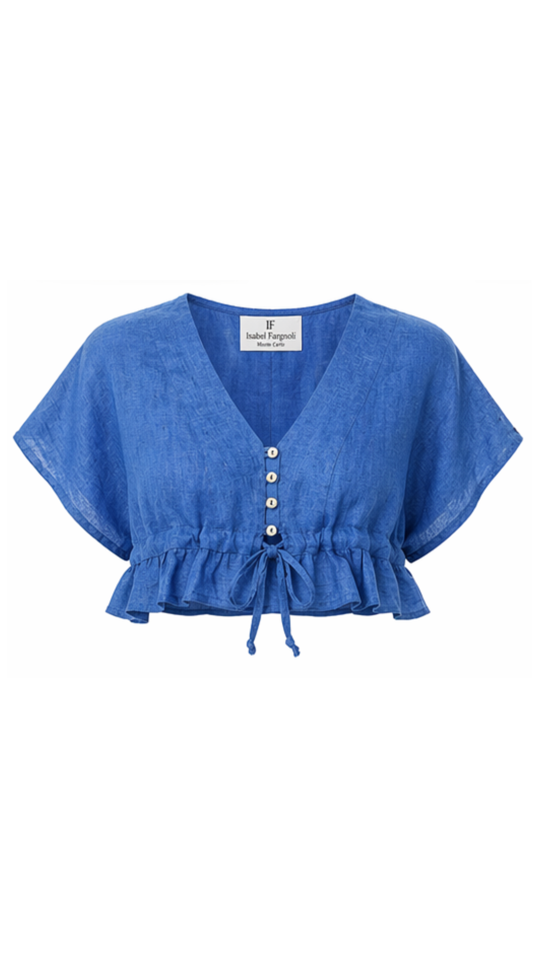 The Royal Blue Crop Top combines playful ruffle details with elegant mother-of-pearl buttons and cute baby T-shirt sleeves. Crafted for a soft, structured fit, it adds a delicate, fun touch to any look while maintaining effortless sophistication. Perfect for stylish, breathable comfort with a refined finish.